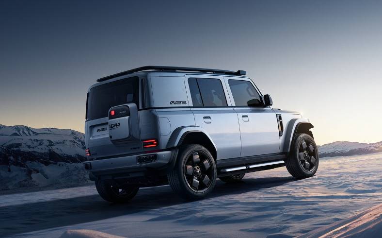iCAR V23定位紧凑型SUV,具体长宽高分别为4220×1915×1845 mm,轴距2753mm。虽然两车差了一个级别,但是关键数据倒是没有太大差距。该车的车身造型主打一个短小精悍,对于越野车型来说,越短的车身则意味着更好的通过性,而事实也确实如此,其接近角为43度,离去角41度,平时开它简单跑跑非铺装路面应该是不在话下。同时,该车于车尾部分设置了小背包,并且采用偏右设计,左边为牌照架留了位置,其尾门采用侧开方式,很对越野迷的口味。