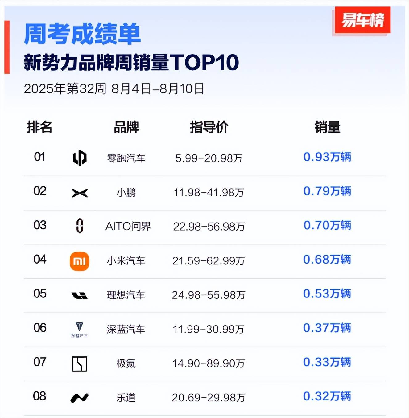 具体来看,在2025年第32周,零跑汽车以0.93万辆位居榜单。不过要是经常关注新势力的话,其实都知道零跑从2024年就崛起了,到了今年更是全面开花,上半年已经拿下了新势力的销冠,将理想、问界等有力竞争对手甩在了身后。