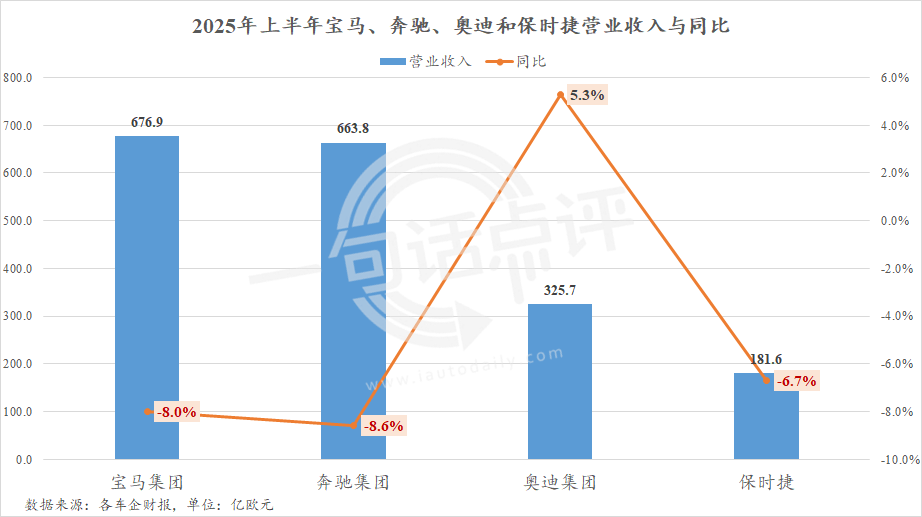 ●奔驰集团上半年8.6%的营收跌幅是四家中最大的,金额为663.8亿欧元;其中二季度同比下跌9.8%至331.5亿欧元。