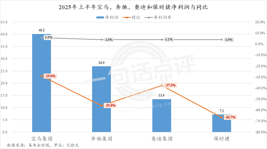 ●宝马上半年的净利润在四家中是最高的为40.2亿欧元,同比跌幅虽达到29%,但已是四家最小的,其中二季度为同比下跌31.9%至18.4亿欧元。