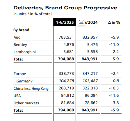 ●奥迪上半年的总销量为79.4万辆,同比下跌5.9%,旗下的品牌中只有兰博基尼微增2.2%,奥迪和宾利分别下跌5.9%和11.0%,其中体量最大的奥迪品牌销量直接减少4.9万辆。