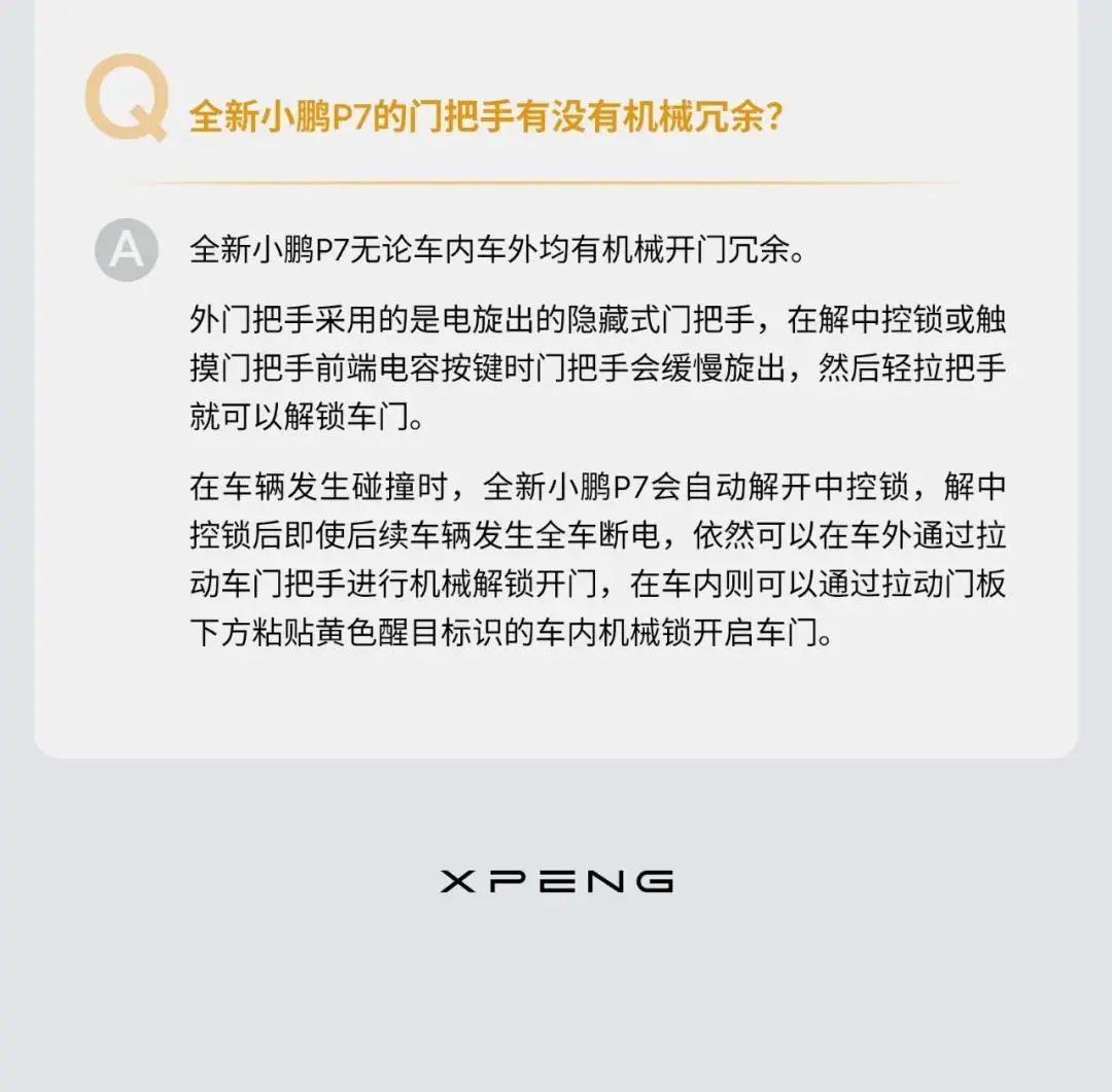 10月15日,小鹏汽车官方发布新一期全新小鹏P7答用户问。答问中提到,全新小鹏P7无论车内车外均有机械开门冗余。